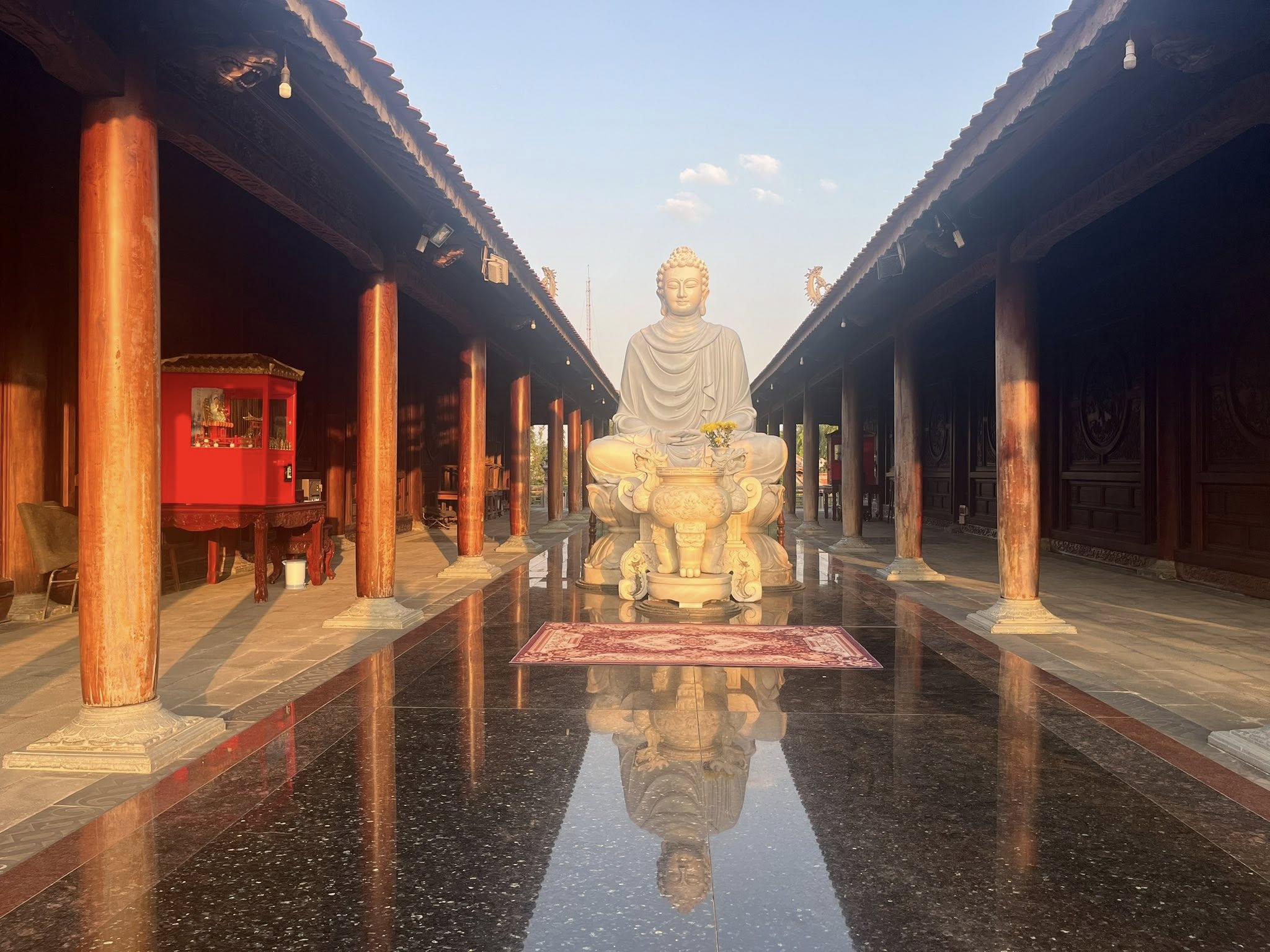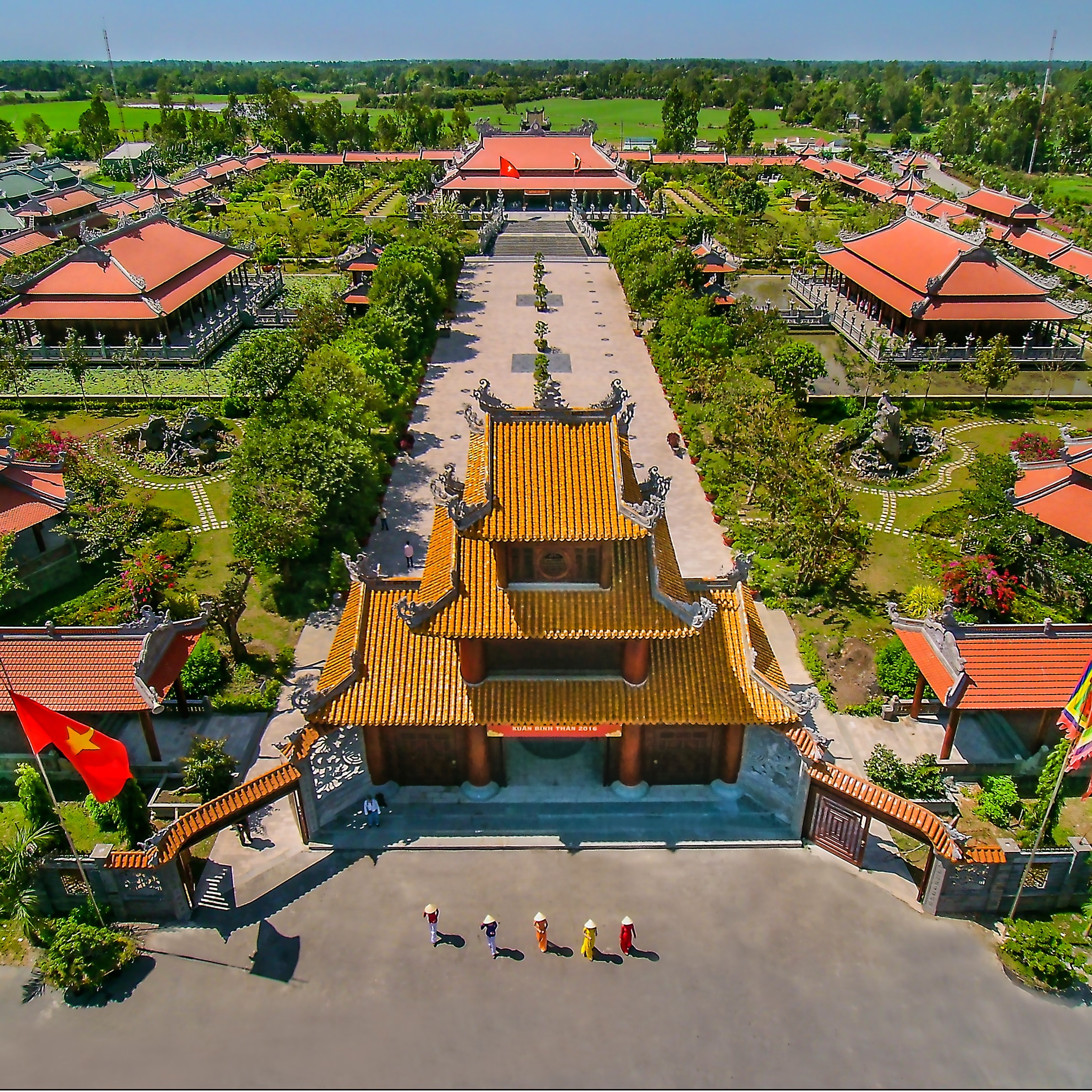 In particular, the highlight is Nam Phuong Linh Tu temple, a building built according to the architecture of old houses - new wood with the style of traditional Hue houses, bearing the imprint of the Nguyen court. The temple has 7 compartments, 2 wings, 3 hearts with lower roof and patio surrounding an area of 509 m2 with 60 pillars (diameter of 0.45 m or more). The door systems, including lam, reliefs, diaphragm, couplets all use wooden carpentry, carved very artistic and elaborate. More specifically, inside the temple there are 21 bronze statues of the people who have opened the time and the spirit of 125 characters who have publicly discovered, preserved and glorified the land of the South, including the characters. such as: Nguyen Hoang, Nguyen Anh - Gia Long, Nguyen Hue - Quang Trung, Nguyen Van Nhon, Tran Thuong Xuyen, Duong Ngan Dich, Mac Cuu, Pham Cong Tac, Huynh Phu So, ...
