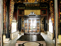The ancient house of Huynh Thuy Le is located at 225A Nguyen Hue Street, Ward 2, Sa Dec city, built by Mr. Huynh Cam Thuan (Mr. Huynh Thuy Le's father) in 1895 and restored in 1917. This house has an architectural style. decorated architecture, unique, showing Eastern and Western architecture combined. Specifically, the traditional architecture is tall, cool inside, walls are built of very thick bricks from 30-40cm surrounding the wooden frame structure, increasing the bearing capacity. However, the shape is in the traditional Vietnamese style, the yin-yang tile roof, the two gables are curved in the shape of a boat in the style of the Northern temple temple in order to create a soft feature for the roof. The house has three compartments, this is the traditional type of Vietnamese people, the wooden doors are elaborately carved, decorated inside the Chinese style. The balcony, painted the gilded lacquer gilded, carved like a Chinese pagoda, the central balcony with double touch Loan Phung shows "Loan Phung Hoa minh sharp grip compromise" means happiness forever. The frames on both sides of the tree show the abundance of the family. Especially, in the middle of the main house, there is Quan Cong worship, this is the traditional Chinese threshold; At the same time, it also shows strength and prosperity in life.