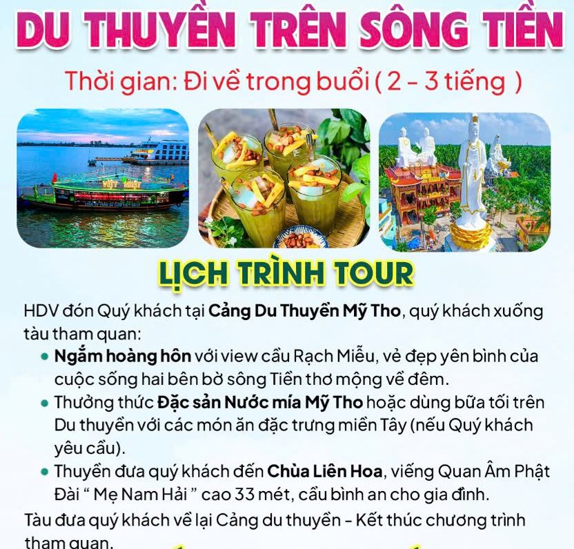 - Khám phá vườn trái cây: Quý khách đi xe máy vào vườn trái cây theo mùa và trải nghiệm hái tại vườn như chôm chôm, măng cụt, sầu riêng...và có thể mua về làm quà. Dùng bữa nhẹ với món cháo gà đặc trưng miền Tây.