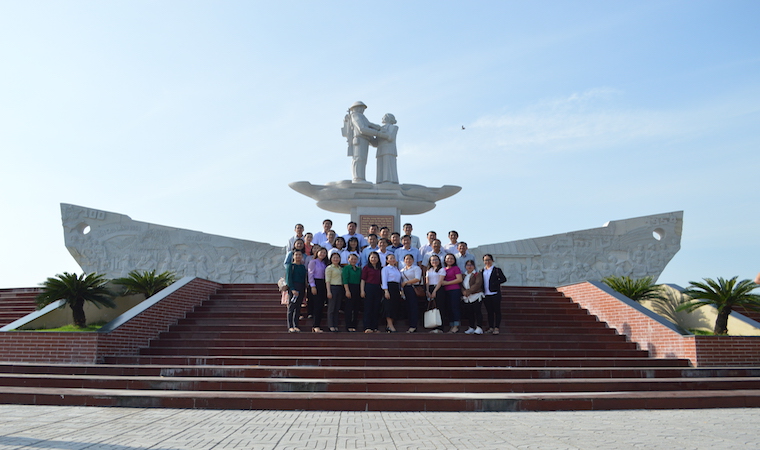 Du khách chụp ảnh lưu niệm tại tường đài sự kiện tập kết năm 1954