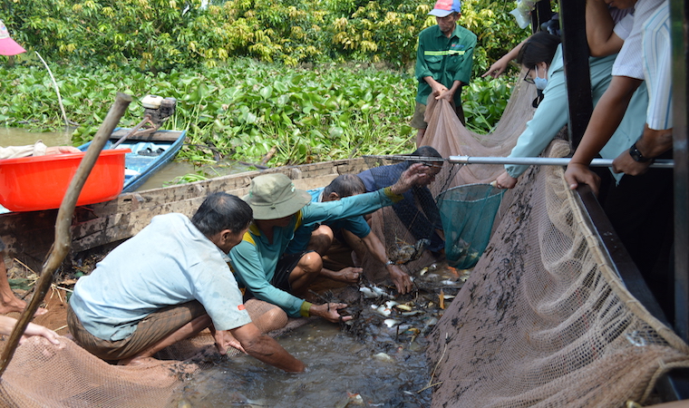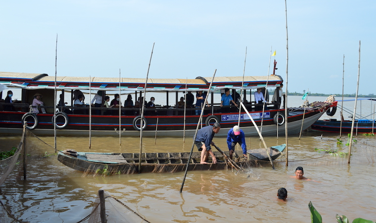 Du khách xem hoạt động dỡ chà bắt cá ven sông Tiền