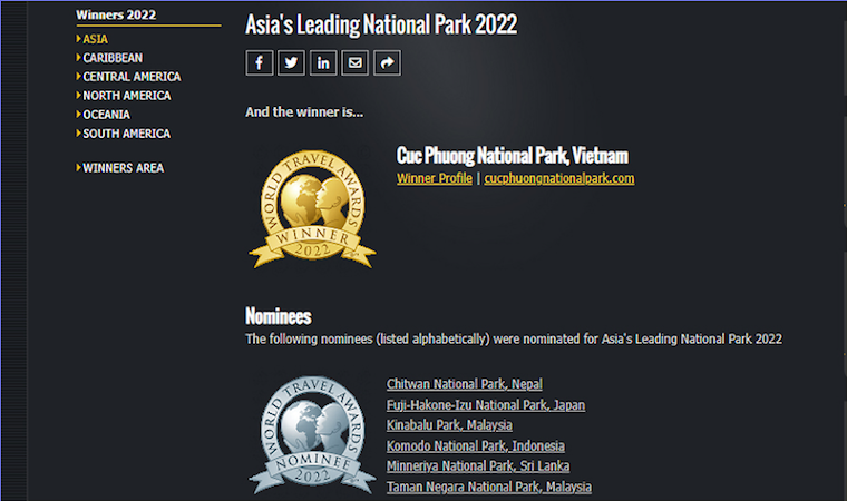 Để dành được danh hiệu này, Vườn quốc gia Cúc Phương đã vượt qua một loạt các ứng cử viên hàng đầu khác trong khu vực như Vườn quốc gia Chitwan (Nepal), Vườn quốc gia Fuji-Hakone-Izu (Nhật Bản), Vườn quốc gia Kinabalu (Malaysia), Vườn quốc gia Komodo (Indonesia), Vườn quốc gia Minneriya (Sri Lanka) và Vườn quốc gia Taman Neqara (Malaysia). Điều này tiếp tục khẳng định sức hấp dẫn của Vườn quốc gia Cúc Phương trong bản đồ du lịch khu vực và thế giới.