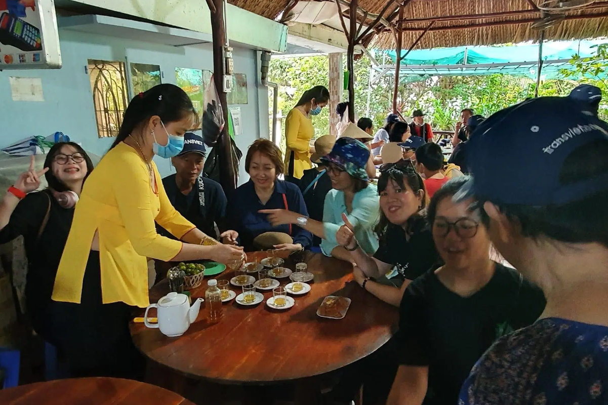 Hướng dẫn viên đón quý khách tại Bến tàu du lịch Mỹ Tho: Số 8 Đường 30/4, Phường Mỹ Tho, Tỉnh Đồng Tháp. Du thuyền trên sông, ngắm nhìn các làng nuôi cá bè trên sông và 4 cù lao Tứ linh: Long – Lân – Quy – Phụng.
