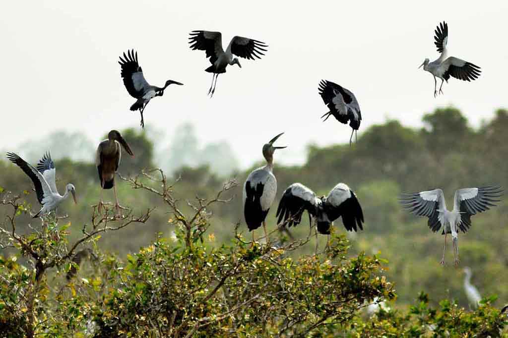 Đến đây, du khách sẽ ngợp mắt trước sân chim rộng hơn 36ha cùng nhiều loài chim bay rợp cả một góc trời. Trên những vạt rừng rộng mênh mông, hàng chục loài chim nước sinh sống và làm tổ quanh năm như: Trích mồng đỏ, Cồng Cộc, Le Le, Diệc, Vịt trời,… Nhiều hơn hết vẫn là cò trắng với hàng chục nghìn con khiến rừng tràm này được xem là vườn cò lớn nhất hiện nay ở vùng Đồng Tháp Mười. Vào mùa nước nổi,trên các cánh đồng hàng nghìn cánh cò trắng bay lượn trên nến tràm xanh tươi tạo thành một khung cảnh ngoạn mục. Còn các lung sen lại là nơi quy tụ hàng nghìn con Trích mồng đỏ về đây thư thả nhổ những cọng năng tươi non. Thỉnh thoảng cất tiếng gáy kèm theo những vũ điệu tuyệt đẹp.
