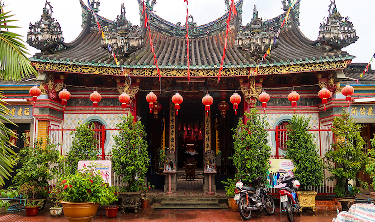 Chùa mang đậm nét kiến trúc Trung Quốc, với tổng thể là hình chữ Công (工)gồm ba gian: Đông lang, Tây lang và khu chính điện thì rộng hơn. Mái ngói gồm 3 lớp, mặt trên ngói, giữa gạch, dưới là ngói. Ngói được lợp theo gợn sóng rồng, trải nền cho những ngọn sóng cong vút lên cao, tạo mái ngói theo kiểu “ngũ hành". Mỗi đầu ngọn sóng là một cung điện thu nhỏ, bao gồm có 6 cung điện. Toàn bộ chùa không có kèo, chỉ có đòn tay ráp mộng lại chịu lực trên những cột gỗ tròn. Trên những bức tường của chùa là những hình ảnh trong Tây du ký, Tam Quốc Diễn Nghĩa,... Phía cổng vào là hai con Kì Lân bằng đá xanh rất lớn, phía trên là tấm hoành phi sơn son thếp vàng lộng lẫy.